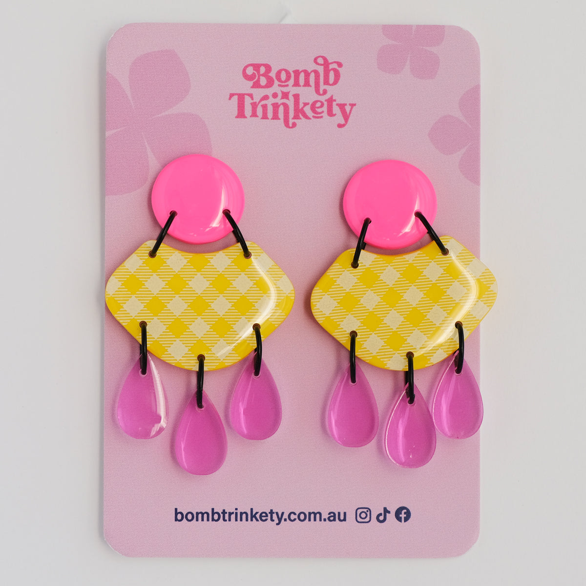 You'll stand out in these bangin' pink and yellow gems! Featuring a bold colour block with tinkly resin drops.