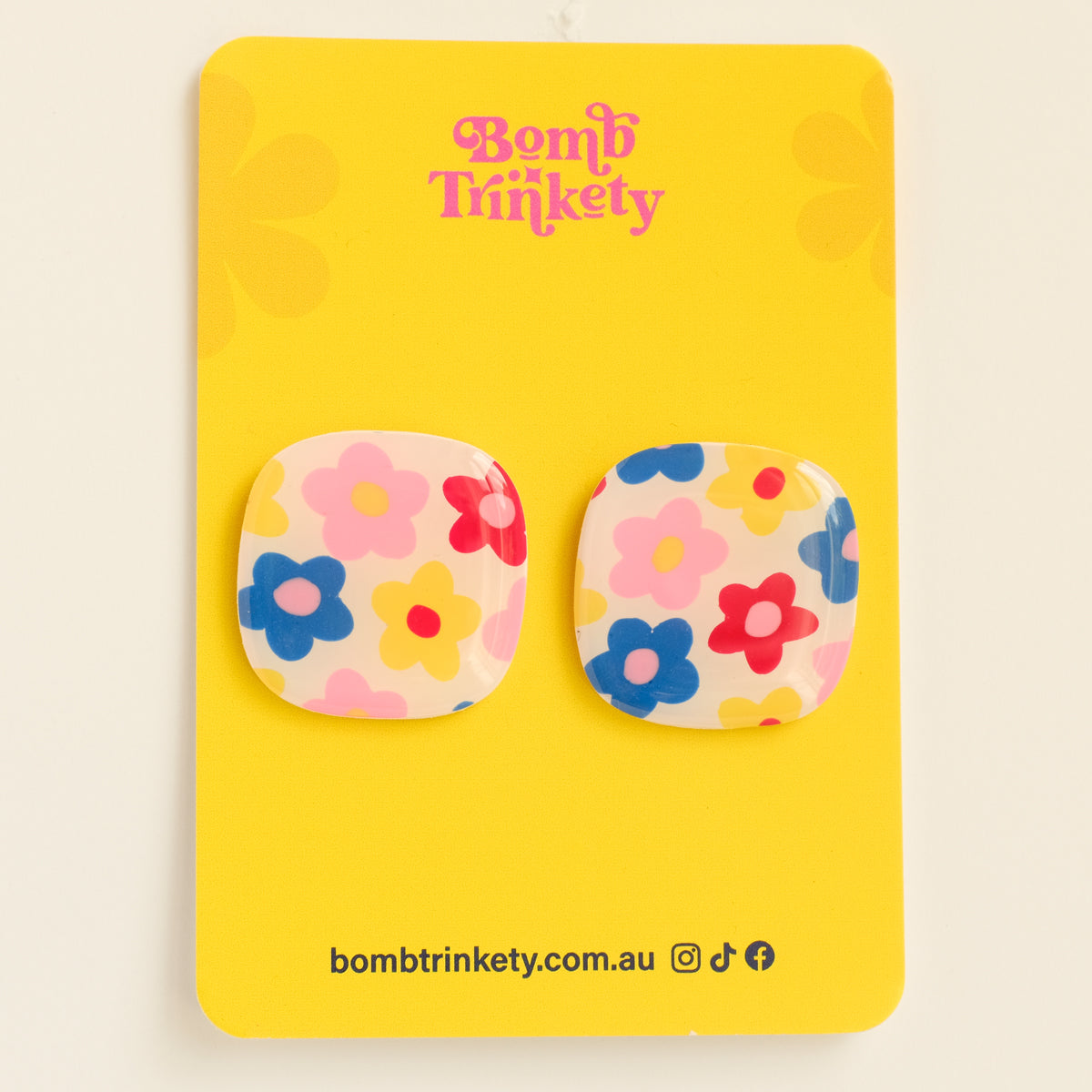 A retro-pop explosion of colour, joy and bold bloom energy. 'Pop Bang Bloom' features cobalt, pink, red and yellow flowers on a white base - with various tops/drops in pop-art polka dots and shiny red.