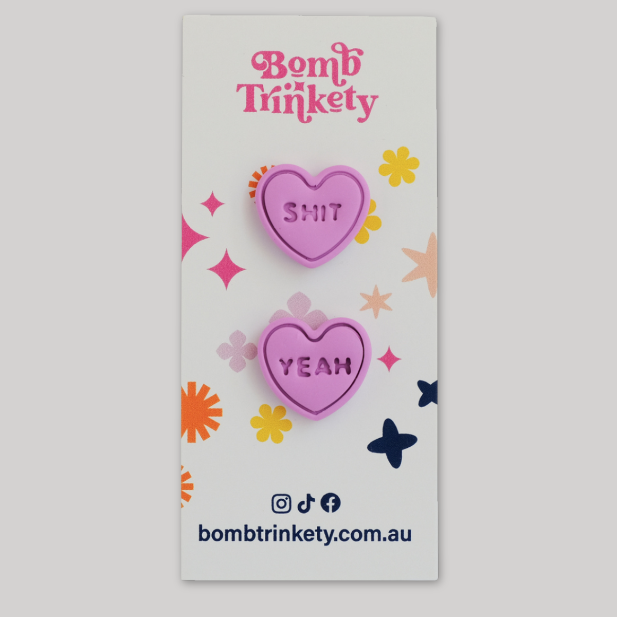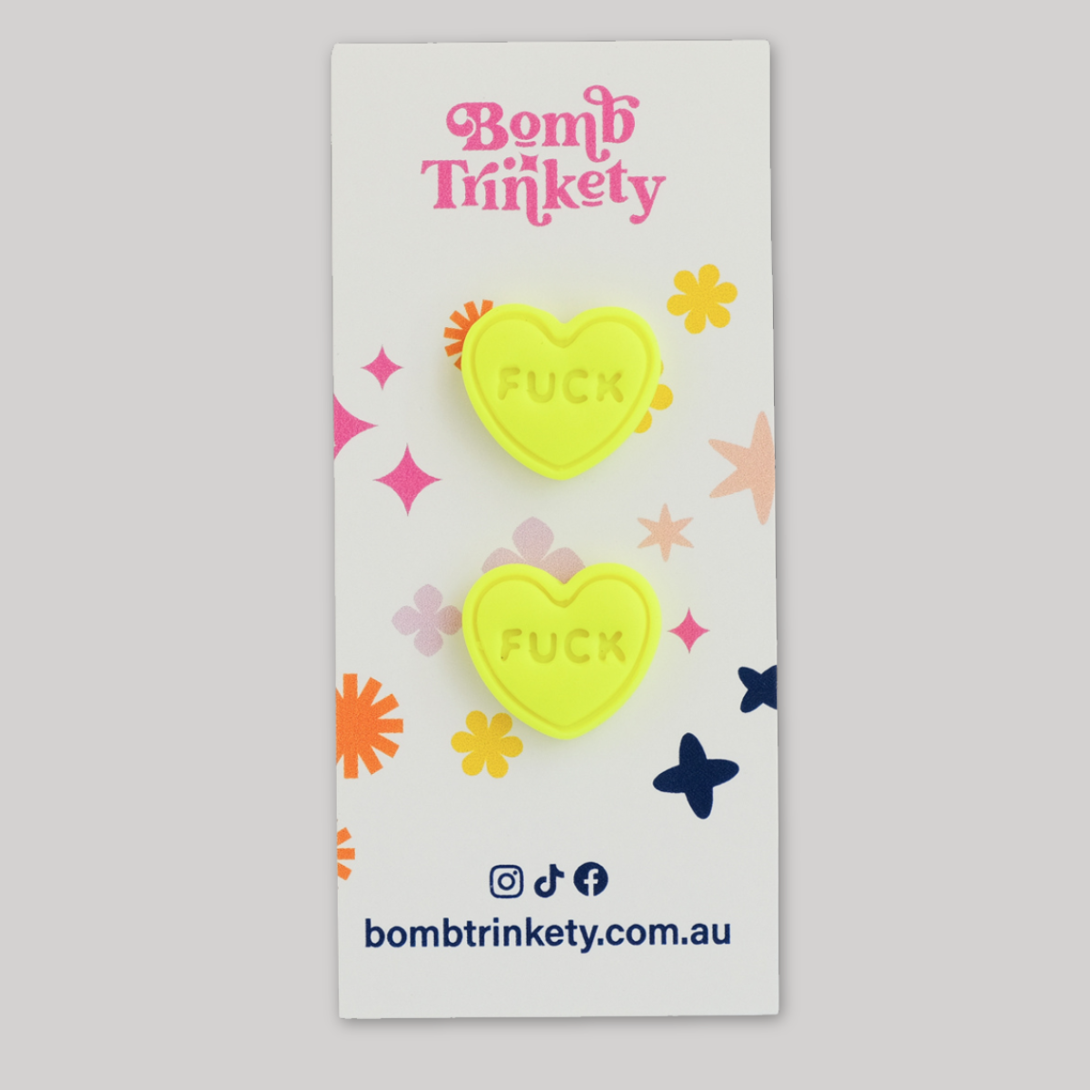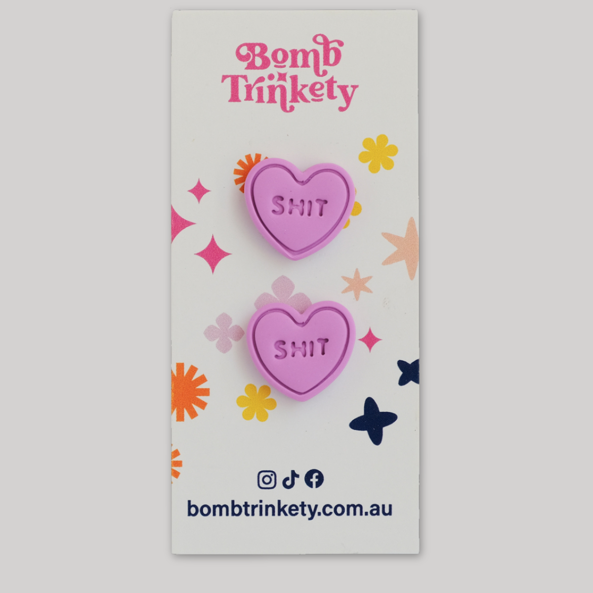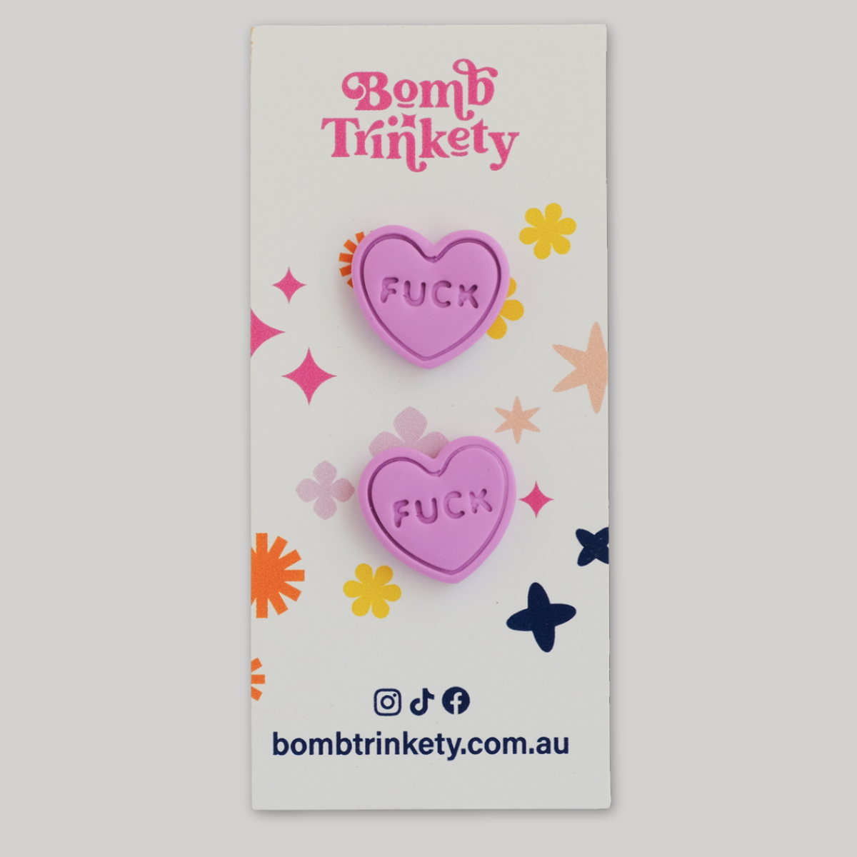 These super fun and totally delicious looking candy heart studs are the perfect little colour pop! Available in assorted colours and cheeky quotes.