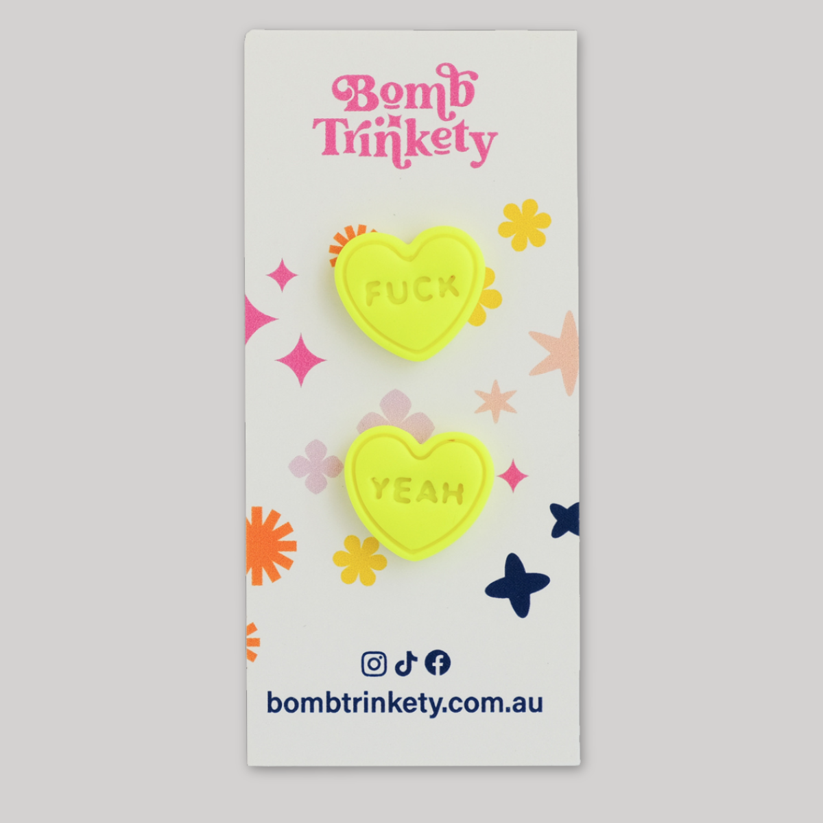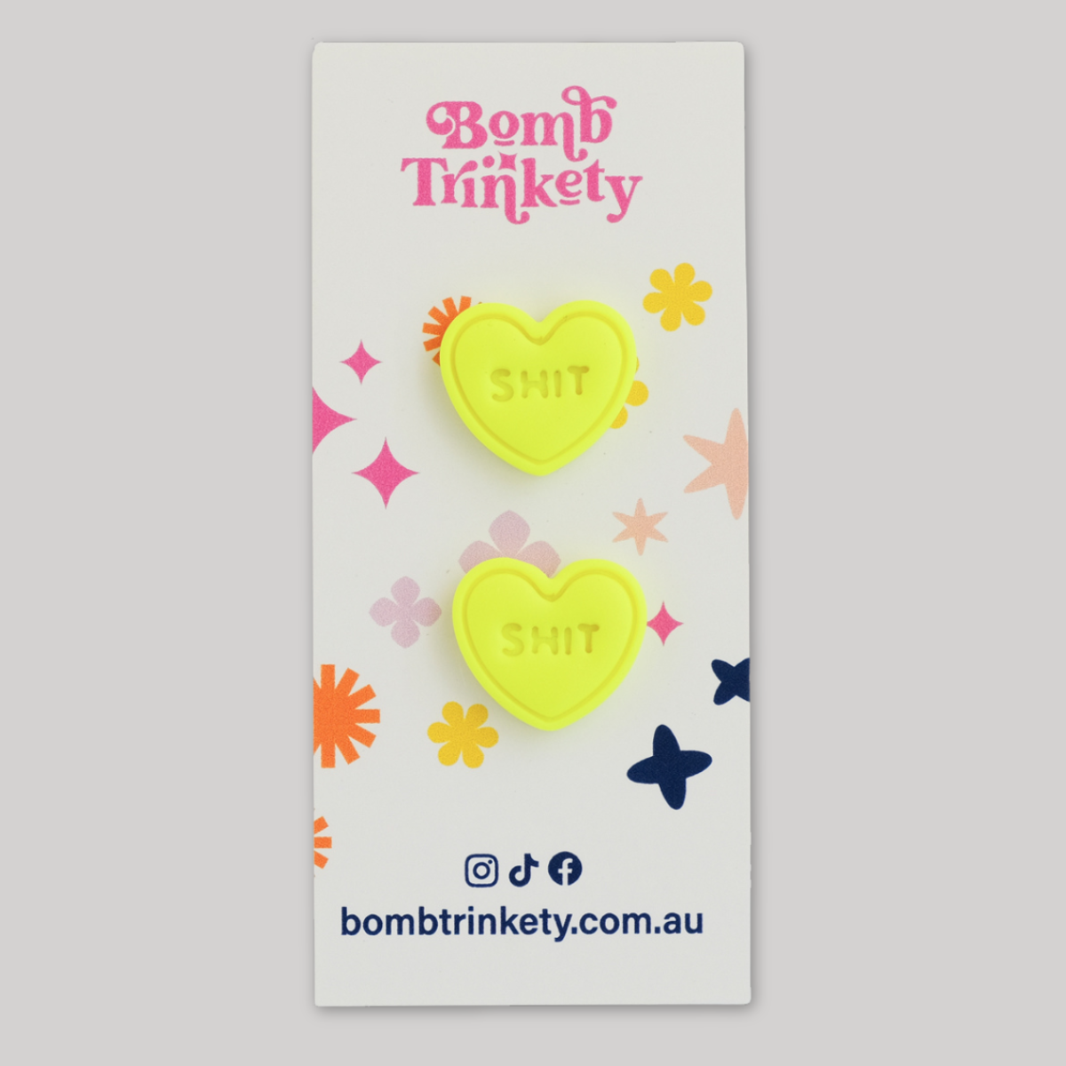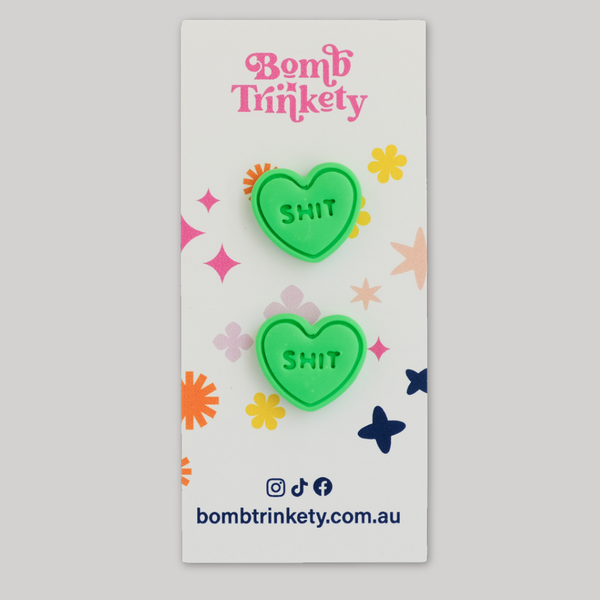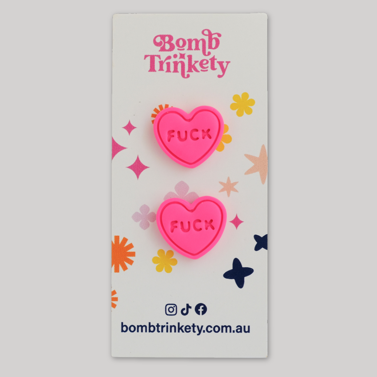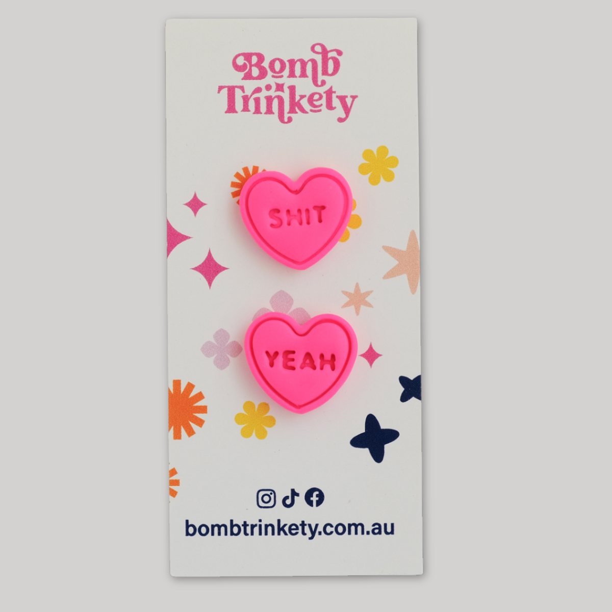 These super fun and totally delicious looking candy heart studs are the perfect little colour pop! Available in assorted colours and cheeky quotes.