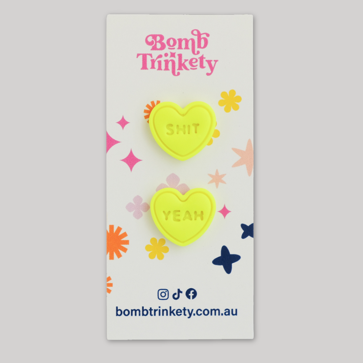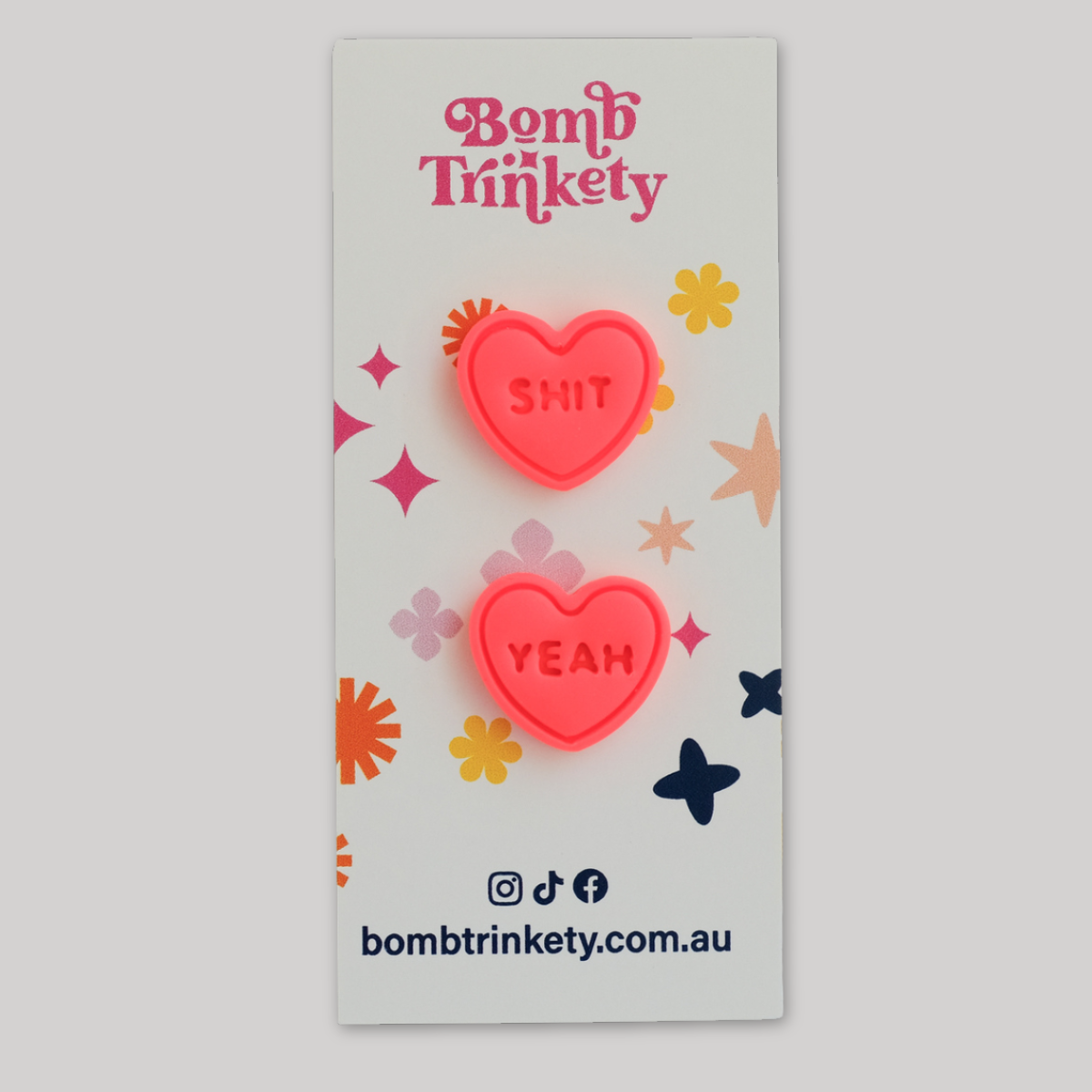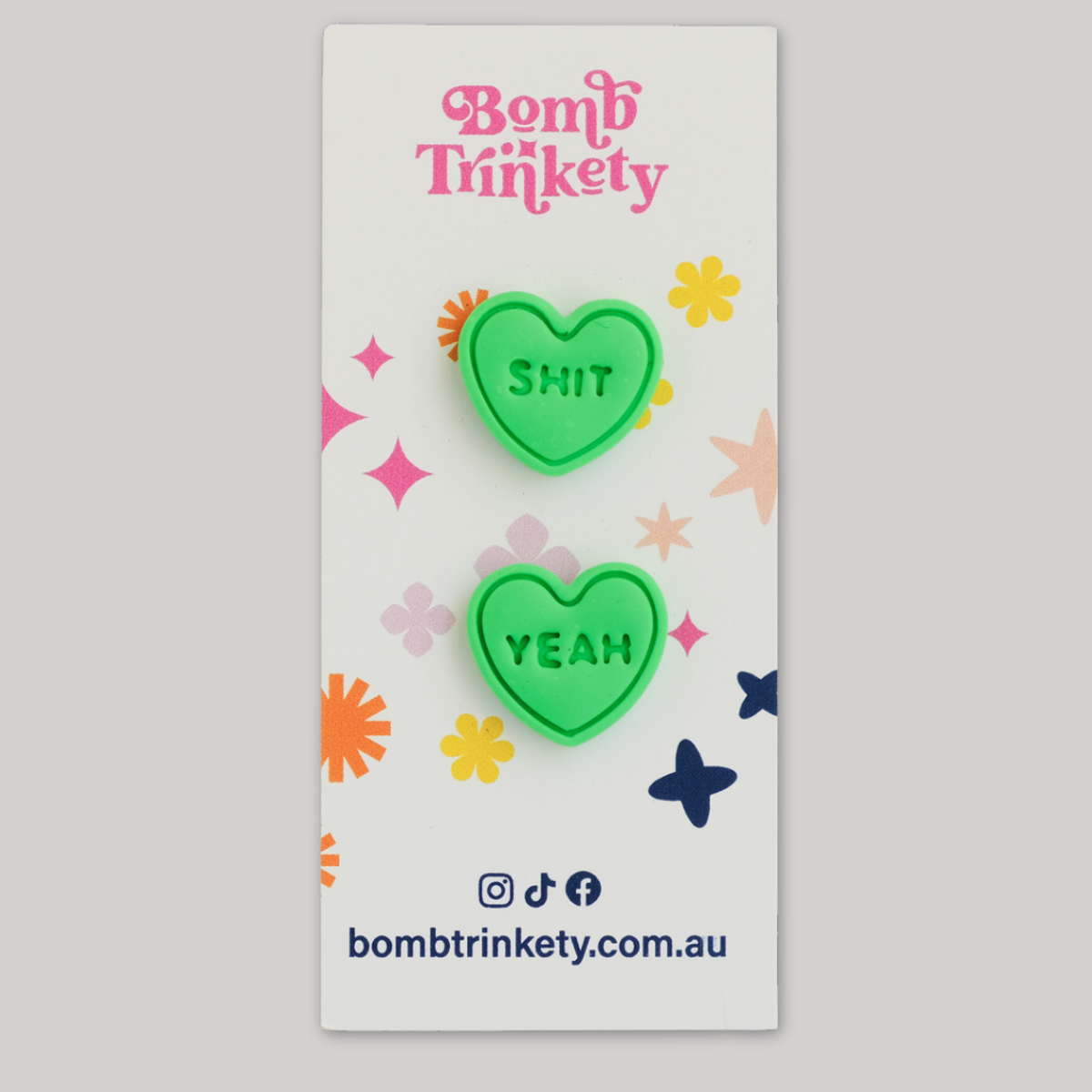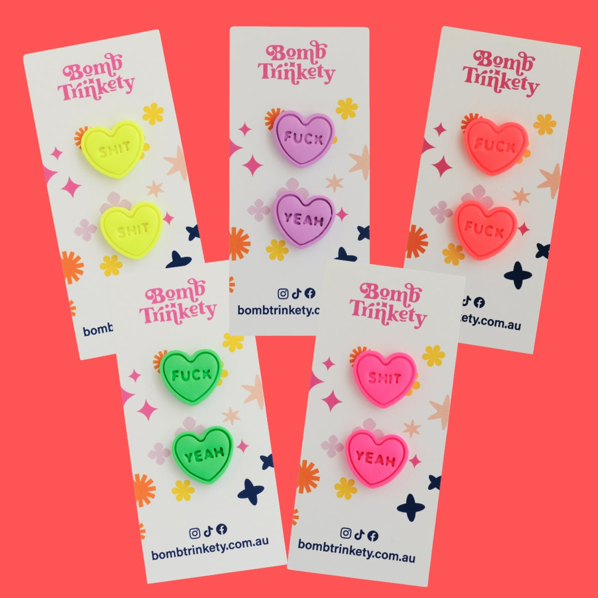 These super fun and totally delicious looking candy heart studs are the perfect little colour pop! Available in assorted colours and cheeky quotes.