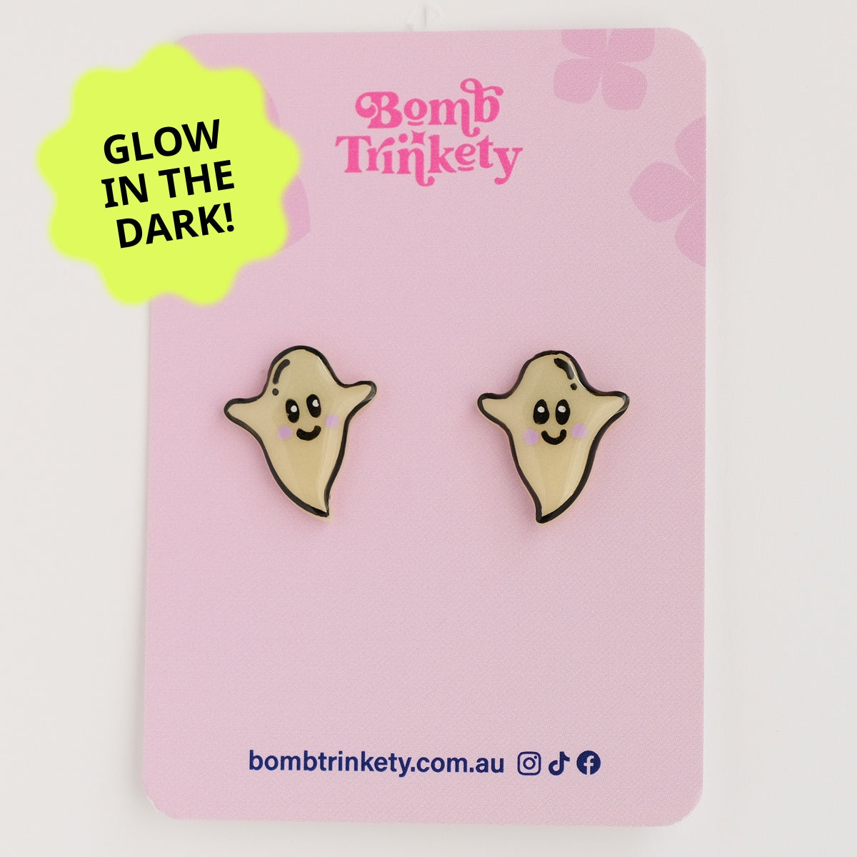 Yes! She glows in the dark! Perfect for trick or treating, halloween parties or just having fun, these ghosties are hand drawn and cute as heck. You know the drill, charge her up under a light and watch the magic happen.